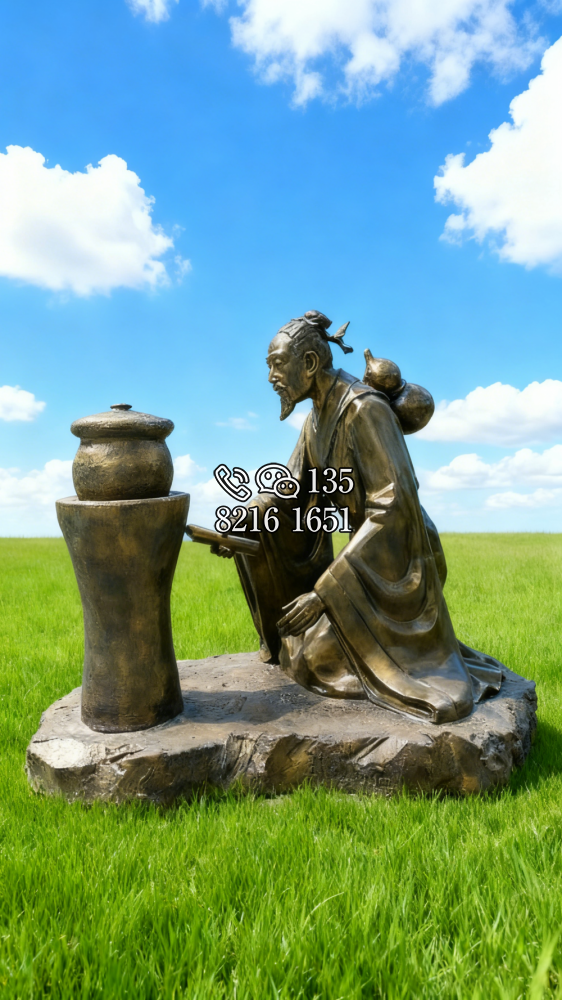 冉雪峰,湖北省中西醫(yī)會(huì)第一屆正會(huì)長,出生于醫(yī)藥世家,12歲起隨父采藥,同時(shí)習(xí)醫(yī)。17歲開診于故里,38歲懸壺于湖北武昌。雕塑高1.68米,玻璃鋼仿銅效果。