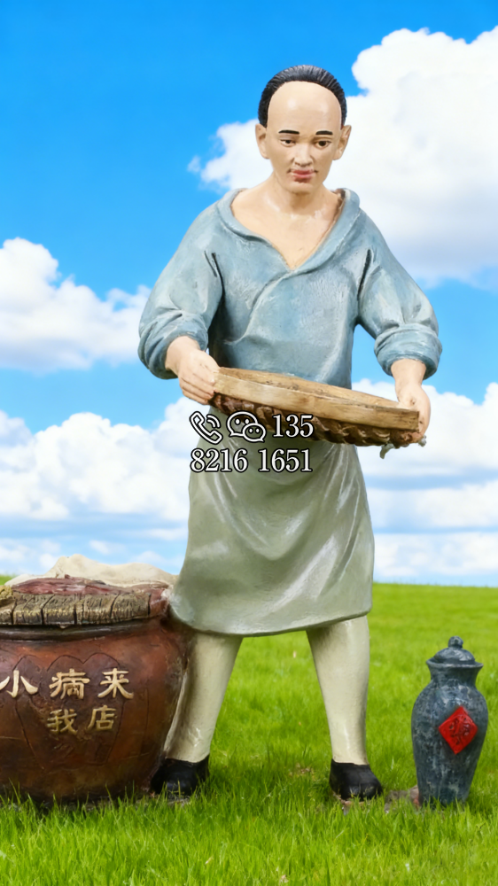 冉雪峰,湖北省中西醫(yī)會(huì)第一屆正會(huì)長(zhǎng),出生于醫(yī)藥世家,12歲起隨父采藥,同時(shí)習(xí)醫(yī)。17歲開(kāi)診于故里,38歲懸壺于湖北武昌。雕塑高1.68米,玻璃鋼仿銅效果。